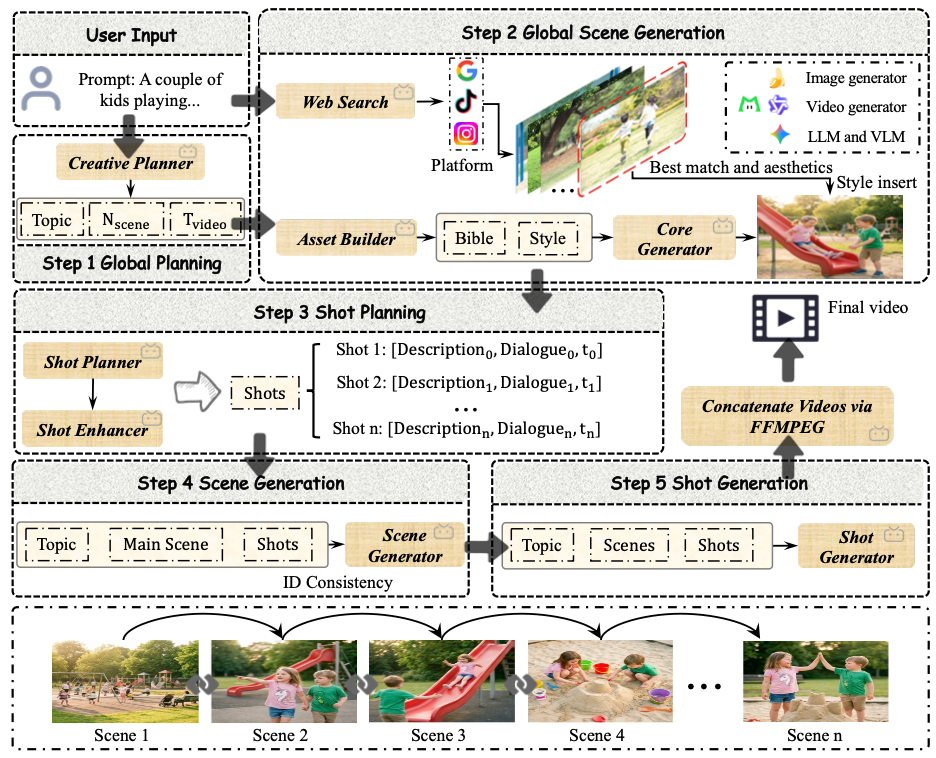 Proposes an agentic framework for generating multi-shot videos with consistent characters and scenes.